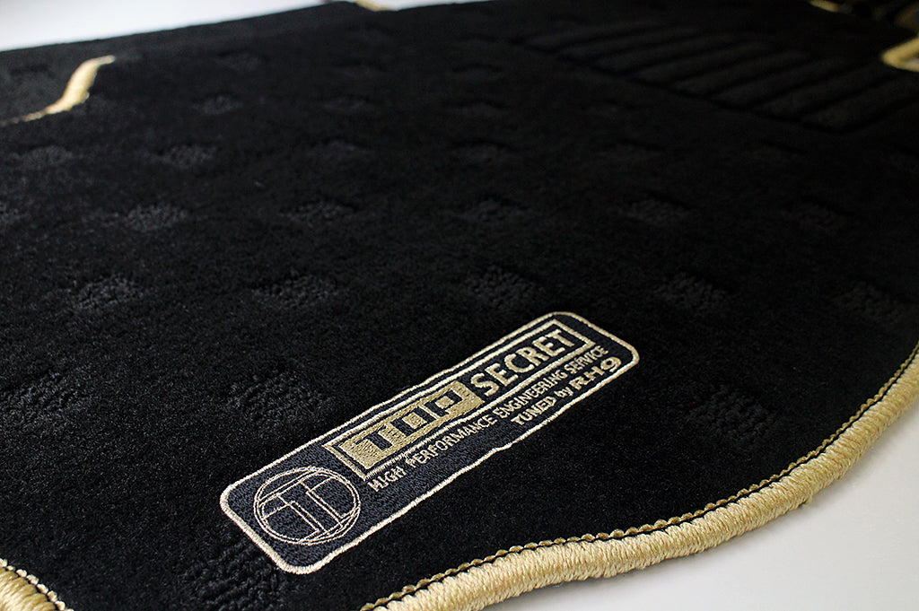 These exclusive TOP SECRET original floor mats feature a black base with gold trim, complemented by the iconic TOP SECRET emblem. Designed for performance enthusiasts, they provide both style and protection for your vehicle’s interior.